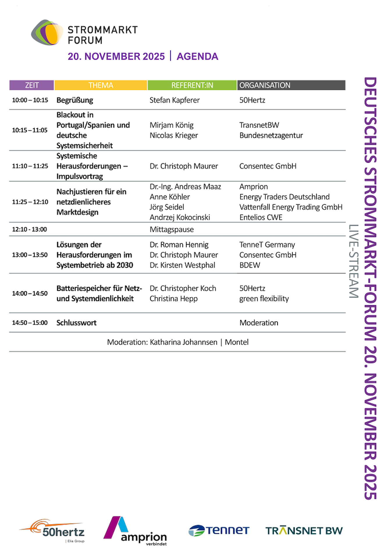 Das 6. Strommarktforum findet am 20.November 2025 statt.Nachfolgend finden Sie die geplante Agenda.