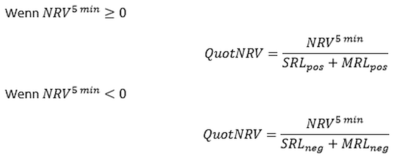 Es wird der Quotient aus dem gleitenden Mittelwert des deutschen NRV-Saldos der letzten 5 Minuten und der für den deutschen NRV dimensionierten Sekundärregelleistung (SRL) und Minutenreserverleistung (MRL) berechnet. Dafür wird bei einem positiven NRV-Saldo (System unterdeckt) die positive dimensionierte SRL und MRL einbezogen und bei einem negativen NRV-Saldo (System überdeckt) die negative dimensionierte SRL und MRL.