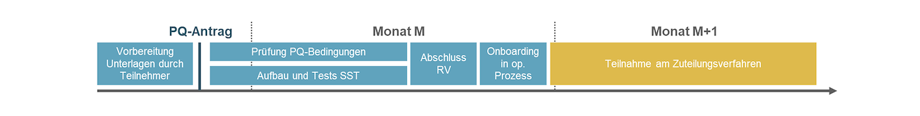 Wird der Antrag bis zum 1. eines Monats eingereicht, hat der Anschluss-ÜNB den restlichen Monat Zeit, die Unterlagen zu prüfen und die erforderlichen Schnittstellen für den operativen Datenaustausch einzurichten und zu testen. Ansonsten steht dem Anschluss-ÜNB der nächste Kalendermonat zur Verfügung. Die folgende Abbildung veranschaulicht den Ablauf des Präqualifikationsprozesses.