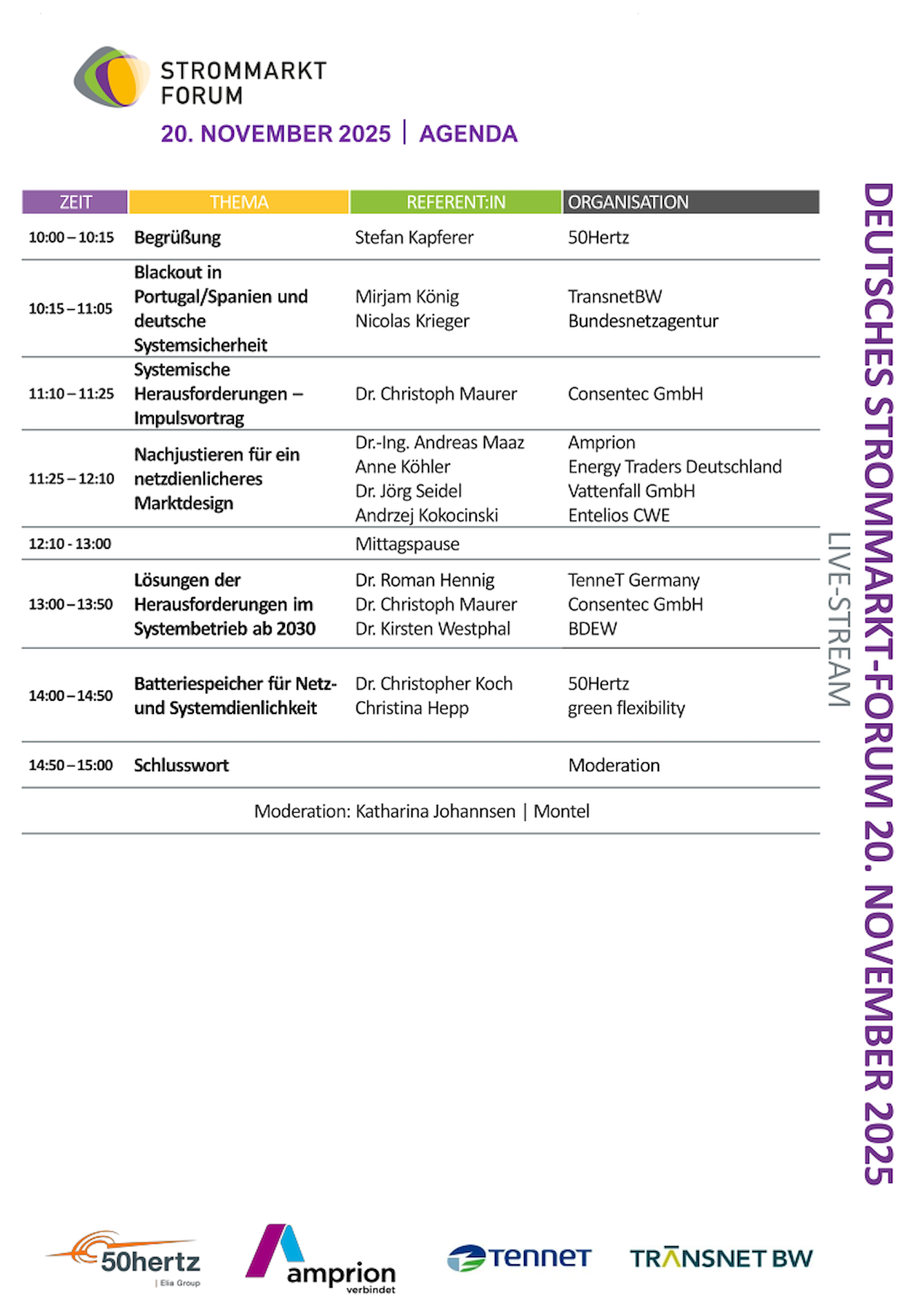 Grid operators, electricity traders, authorities, associations, research institutions and other stakeholders can discuss current market topics, address political issues and discuss development prospects. We look forward to exciting topics and high-caliber speakers.